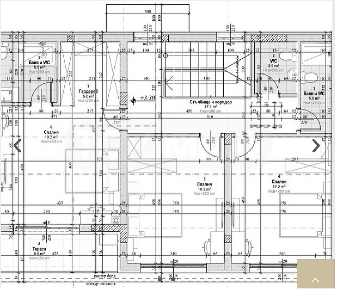 ВТОРИ ЕТАЖ: стълбище и коридор /17.1 м2/, тоалетна /2.9 м2/, баня с тоалетна /5.5 м2/, спалня /17.2 м2/, втора спалня /16.2 м2/, трета спалня / 19.2 м2/, гардеробна към третата спалня /5 м2/, баня с тоалетна /5.5 м2/ и тераса /6.5 м2/. Къщата разполага и със собствен двор.