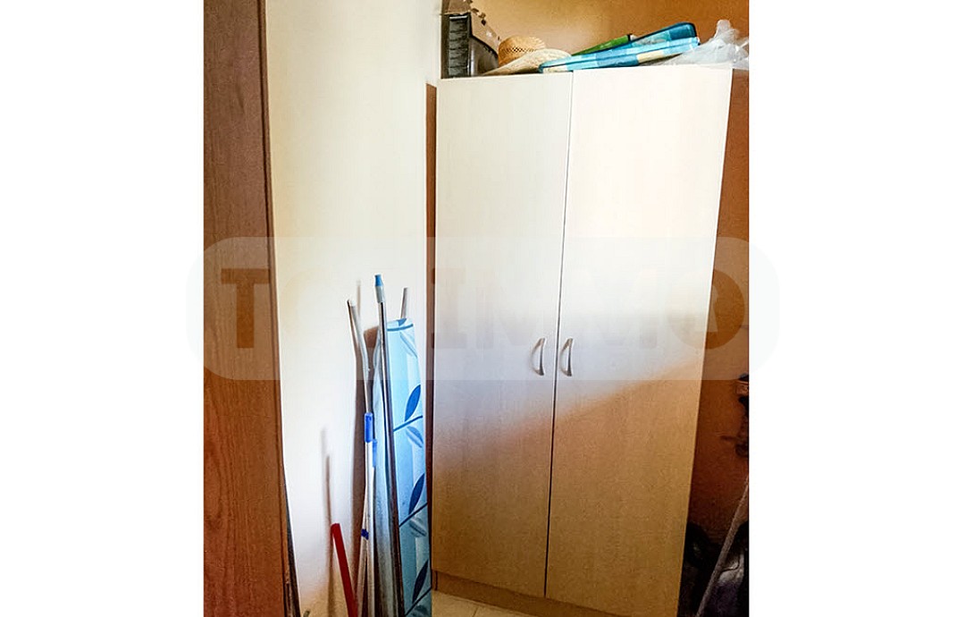 Die erste Etage besteht aus einem Wohnzimmer mit Küchenbereich, einem Abstellraum und einem Badezimmer mit WC und Dusche. Vom Wohnzimmer aus gelangt man auf die Terrasse und in den Garten, wo sich ein Esstisch und ein Grill befinden.
