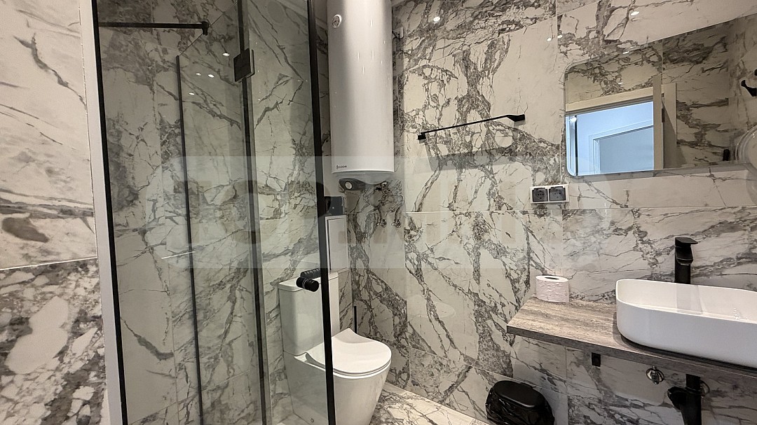 - Luxurious bathroom, filled with high-class marble slabs and glass shower cabin
