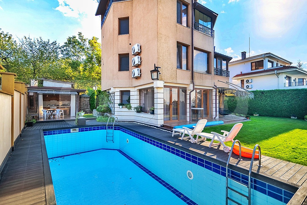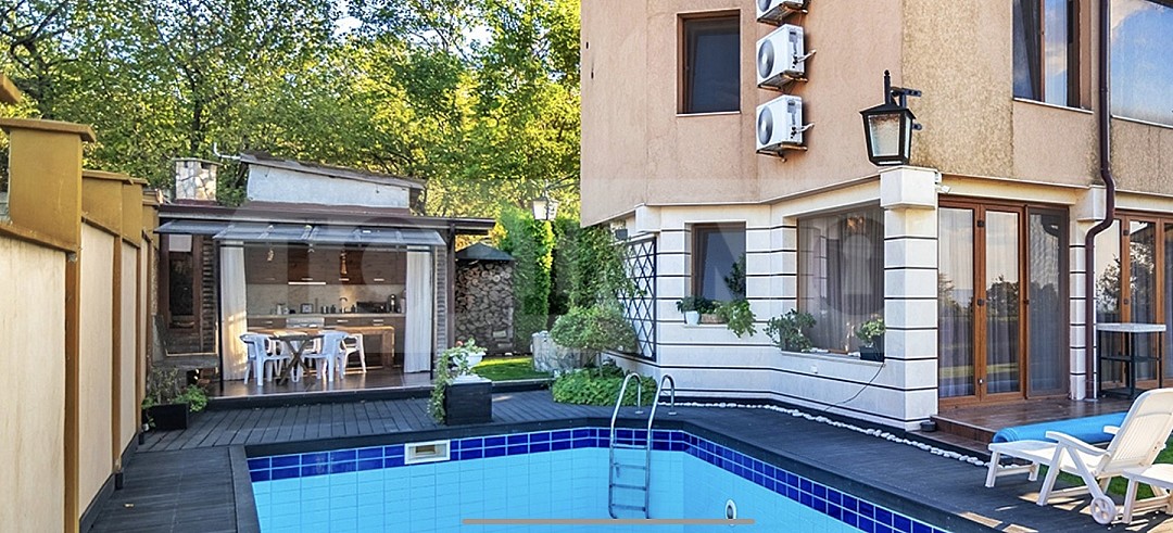 В двора до басейна е разположено закрито през зимата обширно барбекю с камина и напълно обзаведена кухня.