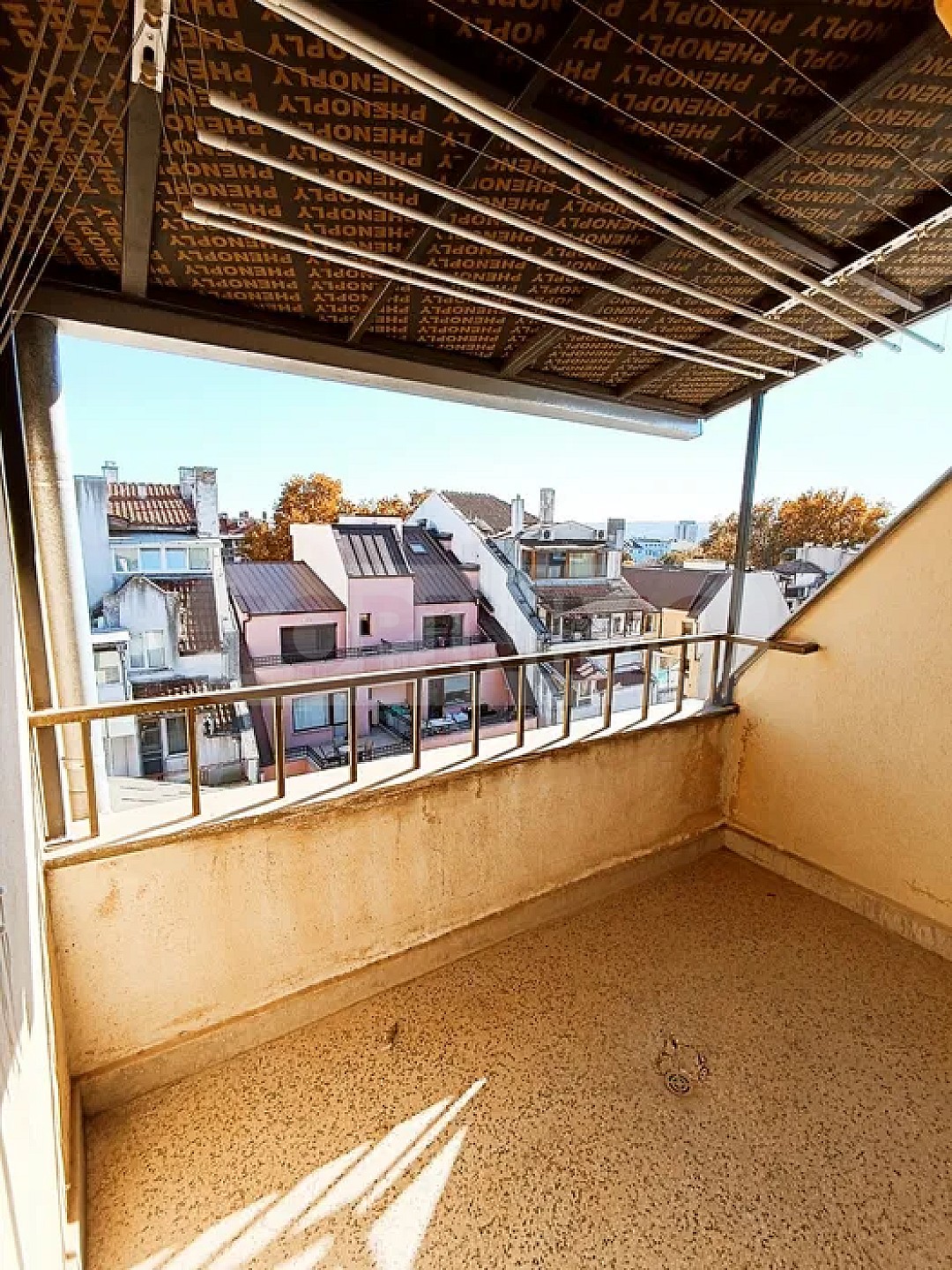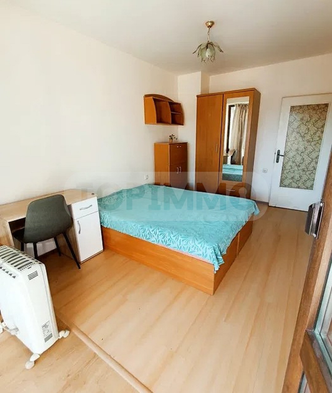 Апартаментът е разположен на 6-ти етаж в шестетажна сграда с асансьор до 5-ти етаж. Състои се от коридор, дневна с кухненска част, две спални, две тераси, баня с тоалетна и килер 10м2. Обзаведен и оборудван, за отопление и охлаждане са монтирани два климатика и подово отопление, има изолация.