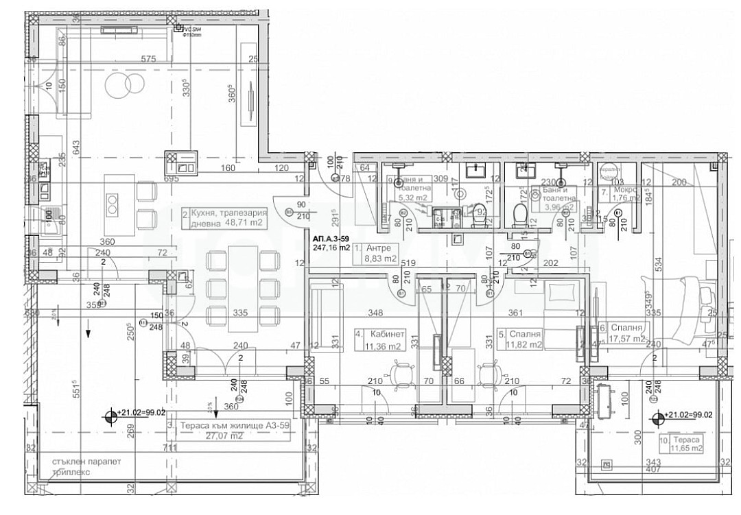Апартаментът се намира на седми етаж, с югозападно изложение и следното разпределение: Г-образен коридор, просторна всекидневна с кухненски бокс 48.71 кв.м. с излаз на тераса 27 кв.м. с невероятна панорама към морето, спалня 11.36 кв.м., втора спалня 11.82 кв.м., трета спалня 17.57 кв.м. със собствен санитарен възел и помещение подходящо за гардеробна, с излаз на втора тераса, втори санитарен възел.