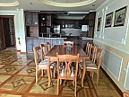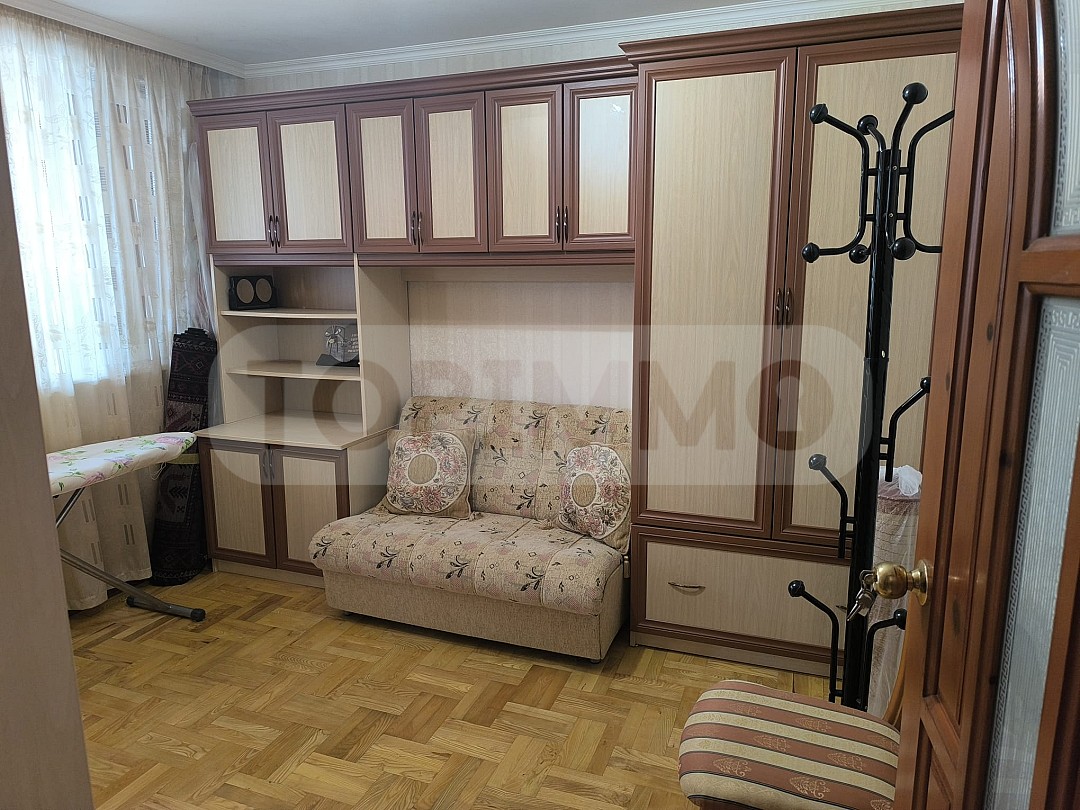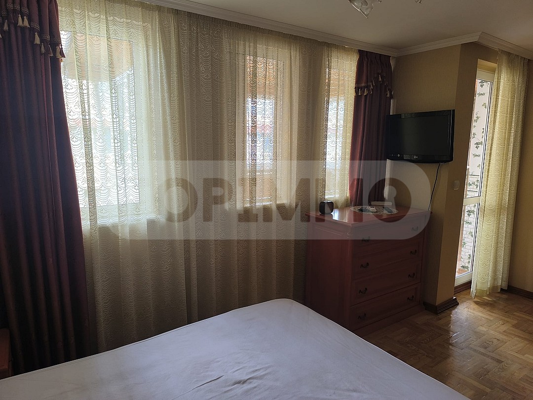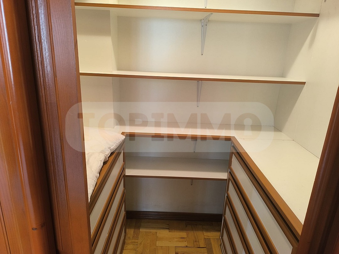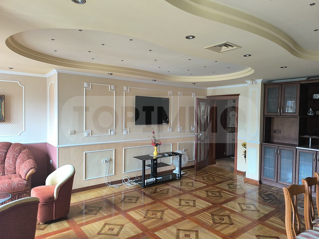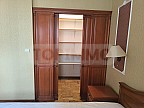 Квартира теплая. Гостиная выходит на юг, а спальня – на север. Паркет натуральный. Мебель массивная, изготовлена на заказ. Потолки подвесные. Большинство дверей раздвижные и не занимают пространство в комнатах. В спальне есть встроенный шкаф.