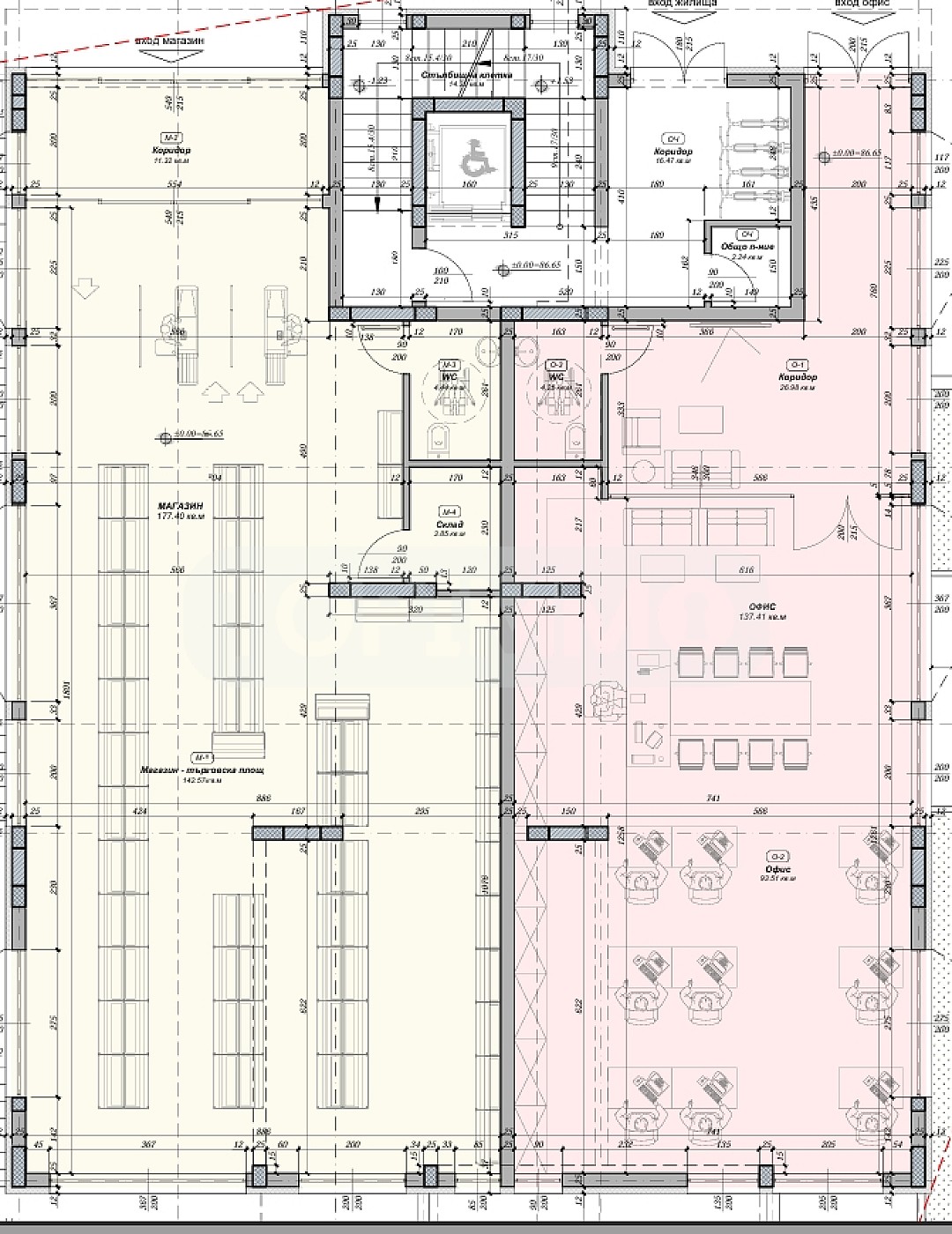 На първия етаж са обособени магазин за промишлени стоки, офис и вход за жилищната сграда с общо помещение, стълбищна клетка и асансьор. Входовете за магазина, офиса и жилищната част са отделни от улицата от север.